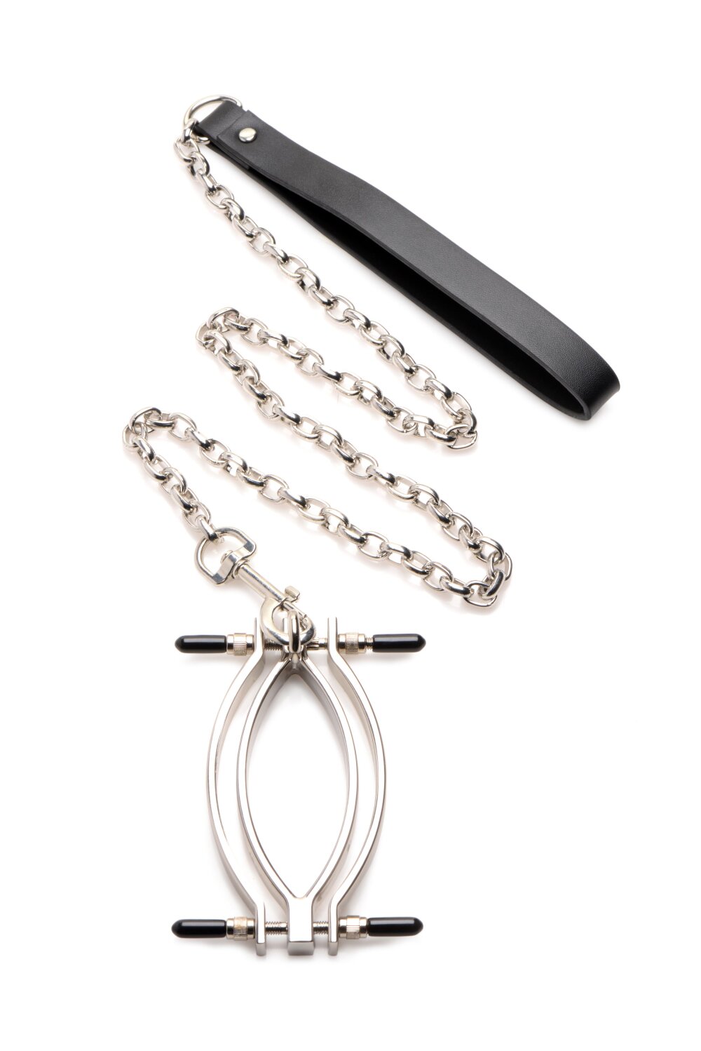 Start by placing the clamp on the labia while the clamp is wide open. Use the small screws on each side of the clamp to set the perfect amount of pressure. Each screw is covered with a small PVC cap for more comfort. At the top, you can attach the chain with a PU leather handle for even more intense play with your partner. Let him or her gently pull on the chain for the ultimate sensation!