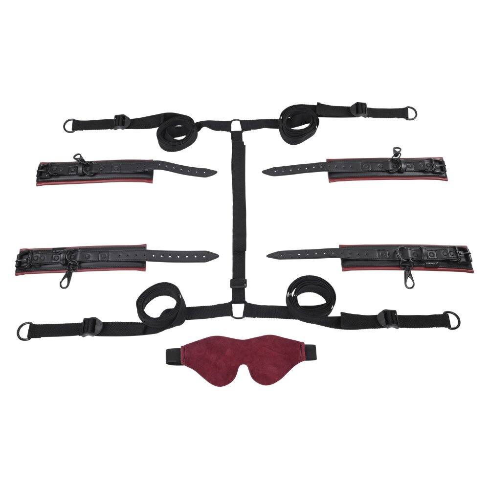 The original (yes, we invented it) Under the Bed Restraint System just got a sultry and seductive new look! Set up in minutes, the alluring deep reds create a lust filled setting made for the naughtiest play. Four luxurious adjustable cuffs in soft and supple faux leather with restraint straps secure to one center connector strap fitting securely under your mattress.
